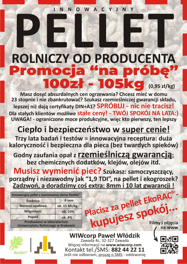 Natomiast jestem przekonany, że zalety pelletu EkoRAC przeważają nad tym (szczególnie, że nienasiąkliwy wkład kominowy jest konieczny również przy pellecie drzewnym, a co najważniejsze: popiół to świetny nawóz mineralny o wysokiej właściwościach odkwaszającej glebę – to nie bezwartościowy popiół z węgla!).