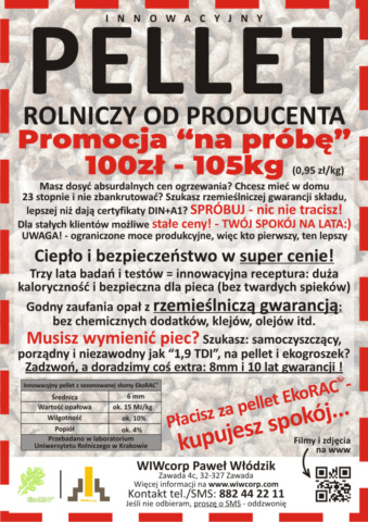 | (0,95 zł/kg) Cena promocyjna w sezonie 2025/26: 1200 zł/t (dla jednorazowych ilości powyżej 1 tony – zapytaj o rabat) Płatność tylko gotówką |